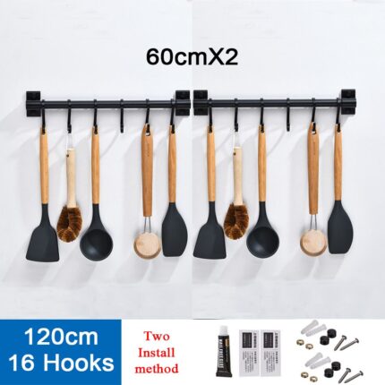 Black Kitchen Hook Rack Wall Mounted Pantry Tool Holder Kitchen Shelf Aluminum Pantry Bar for Kitchenware Utensil Storage Rack